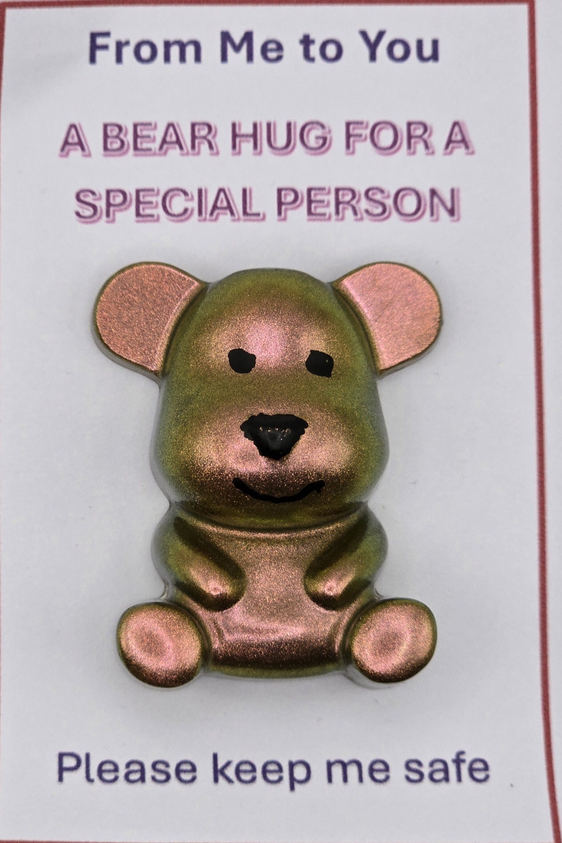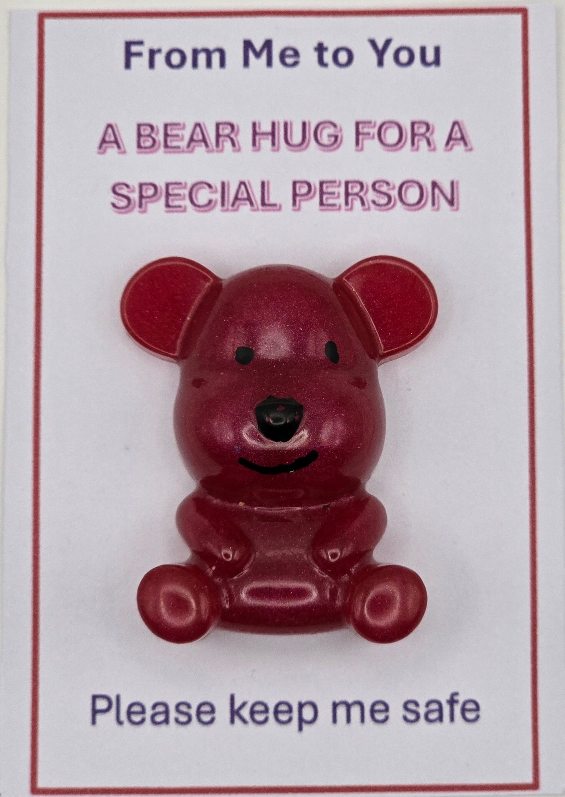 Bear size: 4.3cms in height, 3.5cm wide, depth is 1.5cms.