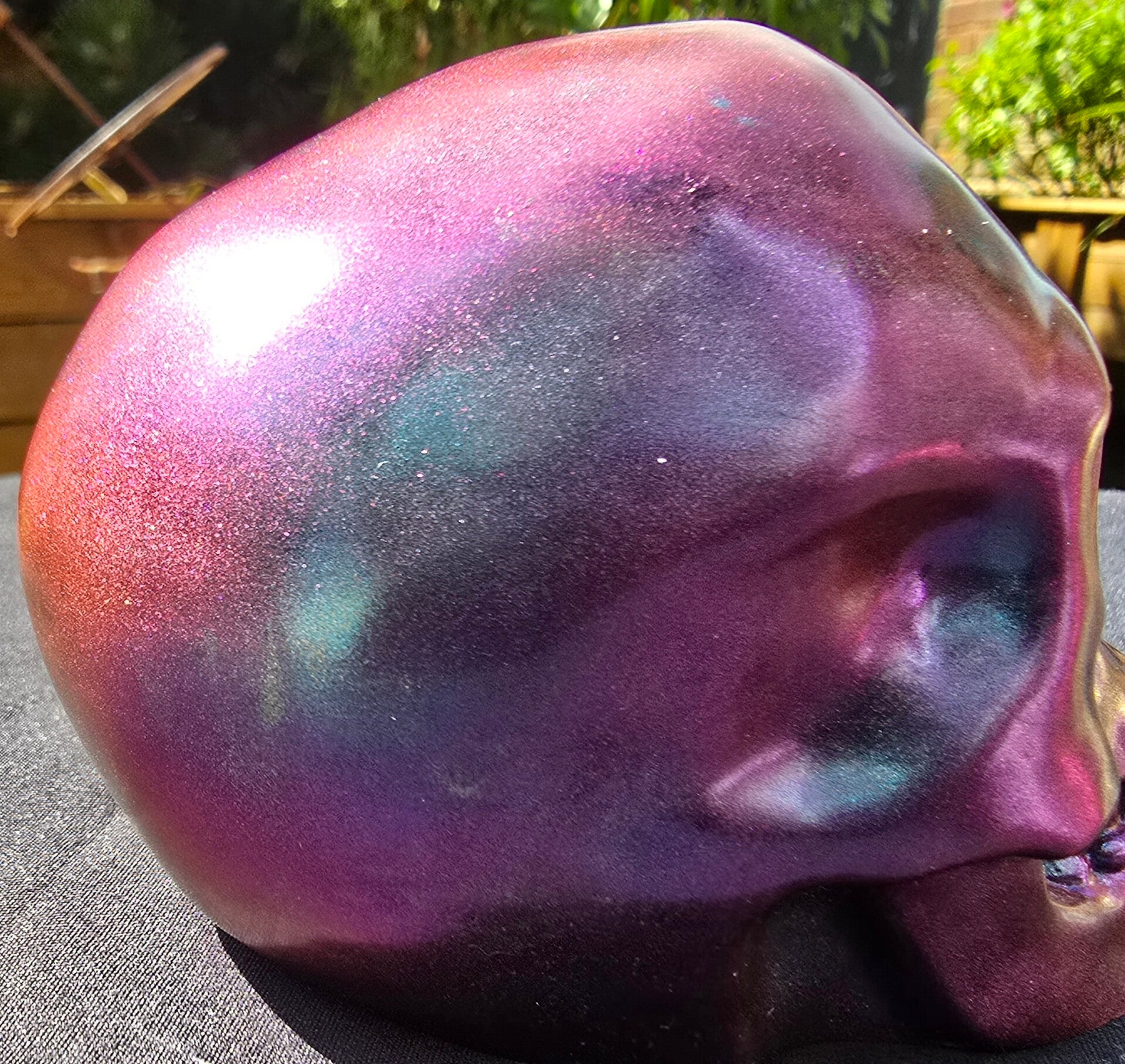 This sizeable skull features an attractive purple and blue chameleon coloration enhanced by a shimmering finish visible from any viewpoint. Its distinctive green and red eyes create a striking visual contrast, ensuring it serves as a notable focal point.
