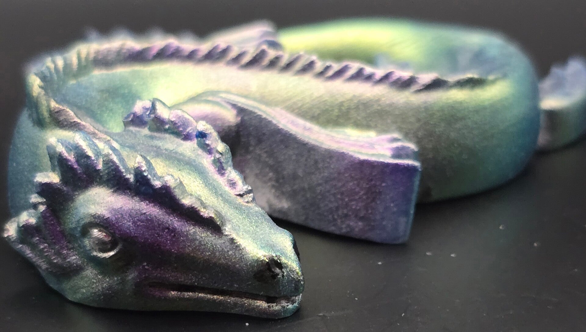 This S-shaped Serpant Dragon is meticulously crafted from resin, featuring a purple-green colour-shifting finish with detailed silver eyes.
